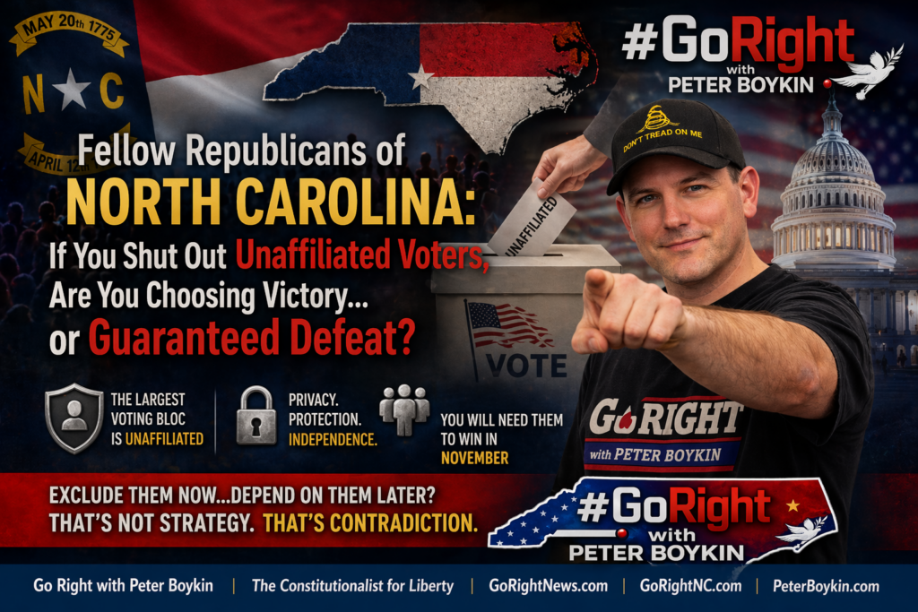 Are We Longing for the Past Because We Know What’s Coming Next? - Are We Longing for the Past Because We Know What’s Coming Next? #GoRightNews Shared by Peter Boykin American Political Commentator / Citizen Journalist / Activist / Constitutionalist for Liberty Are We Longing for the Past Because We Know What’s Coming Next? Right now, something is shifting. Not just in Washington… not just […]Why Are You Working More, Knowing Less, and Still Falling Behind? - Why Are You Working More, Knowing Less, and Still Falling Behind? #GoRightNews Shared by Peter Boykin American Political Commentator / Citizen Journalist / Activist / Constitutionalist for Liberty Why Are You Working More, Knowing Less, and Still Falling Behind? A Quiet Moment That Feels Different There is a moment that does not come […]Is the Constitution Still Supreme or Has the Algorithm Quietly Taken Its Place? - Is the Constitution Still Supreme or Has the Algorithm Quietly Taken Its Place? #GoRightNews Shared by Peter Boykin American Political Commentator / Citizen Journalist / Activist / Constitutionalist for Liberty Is the Constitution Still Supreme or Has the Algorithm Quietly Taken Its Place? A Scroll That Feels Like Freedom It begins with something […]Who Are the Real “No Kings”… and Who’s Been Acting Like One? - Who Are the Real “No Kings”… and Who’s Been Acting Like One? #GoRightNews Shared by Peter Boykin American Political Commentator / Citizen Journalist / Activist / Constitutionalist for Liberty Who Are the Real “No Kings”… and Who’s Been Acting Like One? I remember watching people cheer in the streets, not in celebration of […]Are We Walking Into Another War or Finally Facing the One That Never Ended? - Are We Walking into Another War or Finally Facing the One That Never Ended? #GoRightNews Shared by Peter Boykin American Political Commentator / Citizen Journalist / Activist / Constitutionalist for Liberty Are We Walking into Another War or Finally Facing the One That Never Ended? The Attack You Didn’t See Coming It didn’t […]Is North Carolina the Front Line of America’s Next Political War? - Is North Carolina the Front Line of America’s Next Political War? #GoRightNews Shared by Peter Boykin American Political Commentator / Citizen Journalist / Activist / Constitutionalist for Liberty Is North Carolina the Front Line of America’s Next Political War? A voter walks into a local polling station in Alamance County. No cameras. […]Is Washington Quietly Shifting Food Assistance Costs onto North Carolina While Counties Like Alamance Pay the Price? - Is Washington Quietly Shifting Food Assistance Costs onto North Carolina While Counties Like Alamance Pay the Price? #GoRightNews Shared by Peter Boykin American Political Commentator / Citizen Journalist / Activist / Constitutionalist for Liberty 🇺🇸 Is Washington Quietly Shifting Food Assistance Costs onto North Carolina While Counties Like Alamance Pay the Price? Picture this. A […]Are Democrats Rewriting History While Claiming to Protect Democracy? - Are Democrats Rewriting History While Claiming to Protect Democracy? #GoRightNews Shared by Peter Boykin American Political Commentator / Citizen Journalist / Activist / Constitutionalist for Liberty Are Democrats Rewriting History While Claiming to Protect Democracy? The morning coffee had barely cooled when the headlines started rolling in again. Another political fight. Another […]Did Congress Just Vote to Hide Its Own Sexual Misconduct Files While Demanding Transparency from Everyone Else? - Did Congress Just Vote to Hide Its Own Sexual Misconduct Files While Demanding Transparency from Everyone Else? #GoRightNews Shared by Peter Boykin American Political Commentator / Citizen Journalist / Activist / Constitutionalist for Liberty Did Congress Just Vote to Hide Its Own Sexual Misconduct Files While Demanding Transparency from Everyone Else? Welcome back […]Did North Carolina’s Primary Just Reveal a GOP Divide That Could Cost Republicans in November? - Did North Carolina’s Primary Just Reveal a GOP Divide That Could Cost Republicans in November? #GoRightNews Shared by Peter Boykin American Political Commentator / Citizen Journalist / Activist / Constitutionalist for Liberty Did North Carolina’s Primary Just Reveal a GOP Divide That Could Cost Republicans in November? Politics is a strange ecosystem. Candidates […]Is “Unconstitutional” Becoming America’s Most Misused Political Buzzword? - Is “Unconstitutional” Becoming America’s Most Misused Political Buzzword? #GoRightNews Shared by Peter Boykin American Political Commentator / Citizen Journalist / Activist / Constitutionalist for Liberty Is “Unconstitutional” Becoming America’s Most Misused Political Buzzword? Go Right with Peter Boykin: The Constitutionalist for Liberty A familiar scene plays out again and again in […]Are Unaffiliated Voters About to Decide North Carolina’s Future While Parties Still Fight Yesterday’s Battles? - Are Unaffiliated Voters About to Decide North Carolina’s Future While Parties Still Fight Yesterday’s Battles? #GoRightNews Shared by Peter Boykin American Political Commentator / Citizen Journalist / Activist / Constitutionalist for Liberty Are Unaffiliated Voters About to Decide North Carolina’s Future While Parties Still Fight Yesterday’s Battles? Go Right with Peter Boykin | […]Iran, Reality, and the Balance America Must Face - Iran, Reality, and the Balance America Must Face #GoRightNews Shared by Peter Boykin American Political Commentator / Citizen Journalist / Activist / Constitutionalist for Liberty Iran, Reality, and the Balance America Must Face My entire life, Iran has been presented as the enemy of the United States. That is not something […]Is Trump’s State of the Union a Turning Point or Just Another Political Speech? - Is Trump’s State of the Union a Turning Point or Just Another Political Speech? #GoRightNews Shared by P